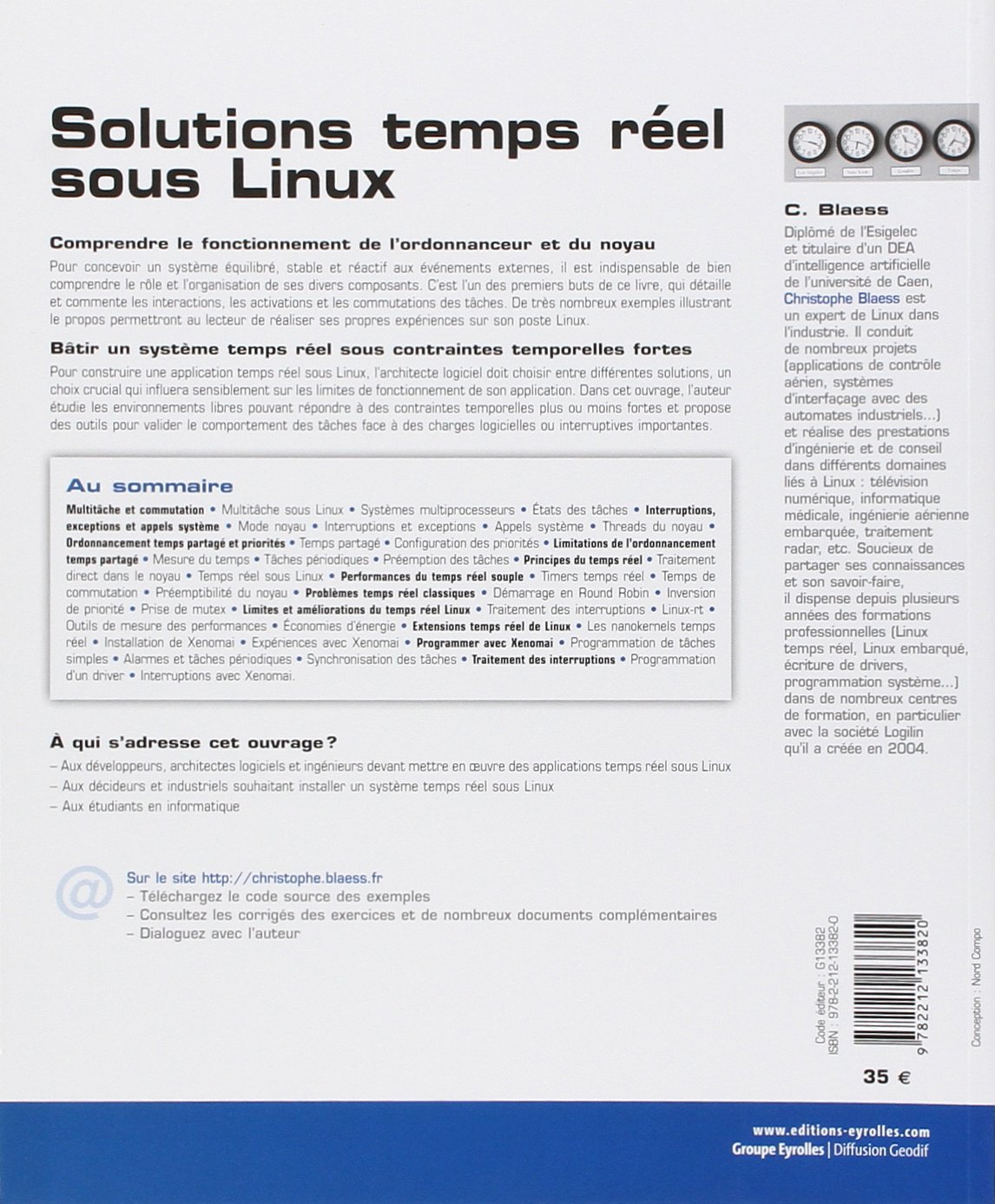 Vous trouverez ici les transparents du cours, les notes et protocoles pour les TP, des questions-type d'exercices et, en due . Xenomai est un sous-système temps-réel de Linux. Ordonnancement temps réel : cours et exercices corrigés. L'essentiel de ce livre porte sur le cas où le système informatique est centralisé. Les systèmes temps-réel embarqués sont caractérisés par leurs fortes interactions avec. Ordonnancement temps réel, cours et exercices corrigés, F. Voici les réponses aux exercices de mon livre Solutions temps réel sous Linux.